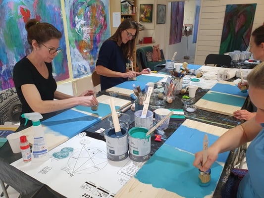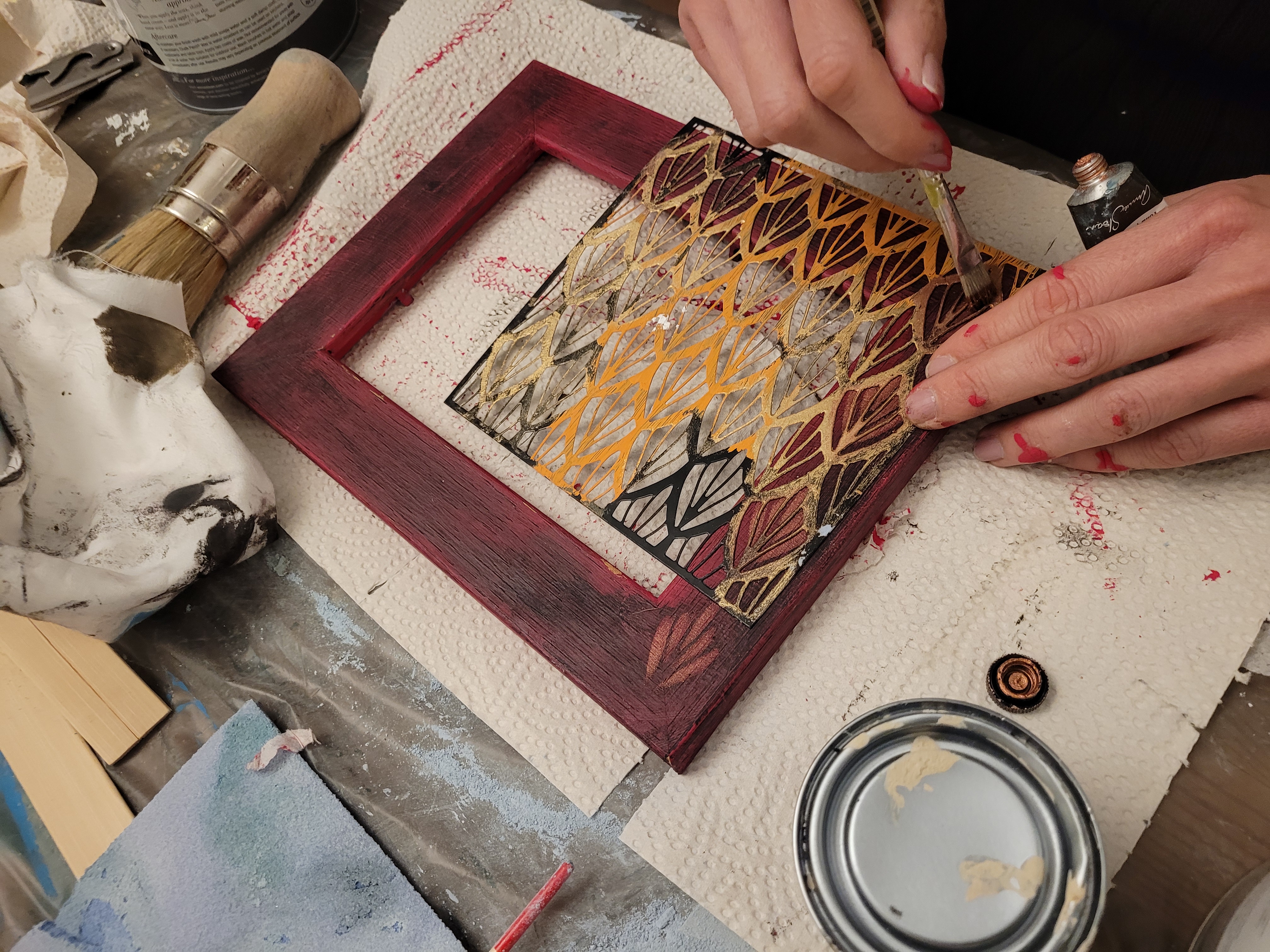 Alle Materialien wie Farben, Wachse und Pinsel, Schablonen, Holzvorlage, Bilderrahmen etc. werden gestellt und für Erfrischung und Gebäck ist gesorgt.
