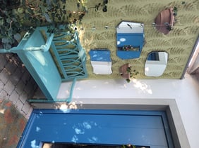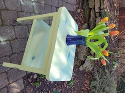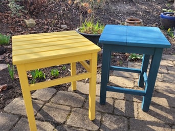 Schemel in Tilton Gelb und Aubusson Blue. Versiegelt mit transparentem Wachs.
