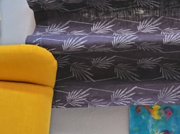 Blättermuster mit einer Strukturwalze und Annie Sloan Chalk Paint "Old White" auf einen dunkelblauen Leinenvorhang gewalzt und durch Bügeln haltbar gemacht.