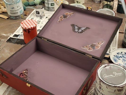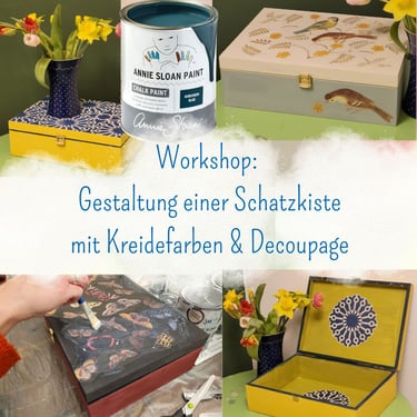 Wir nehmen dafür die englischen Annie Sloan Kreidefarben (Chalk Paints) und neue wunderschöne Decoupage-Papiere aus dem Annie Sloan Zubehör. Sie erfahren im Workshop einiges über die vielseitigen Farben und deren Anwendungs-möglichkeiten. Ich zeige Ihnen außerdem, wie die Decoupage-Papiere auftgetragen werden. Sie gestalten und verzaubern Ihre Kiste nach eigenen Ideen unter Anleitung. Vorkenntnisse sind dabei nicht nötig!