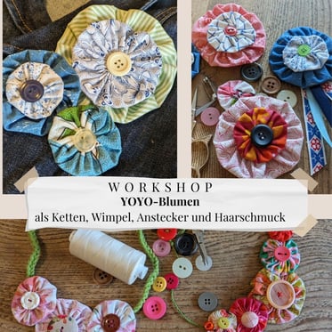 In diesem Workshop kreieren wir die in England überall bekannten YOYO-Blumen (Rosetten) aus Stoffen/Stoffresten. Diese Blumen können Sie als Anstecken, Aufnäher auf Taschen und Kleidung, Wimpel, Ketten oder Haarschmuck verwenden. Materialien wie eine bunte Sammlung an Stoffen, Knöpfen, Nadel und Faden, Schere, Schablonen , Bänder, Anstecknadeln etc. werden gestellt.