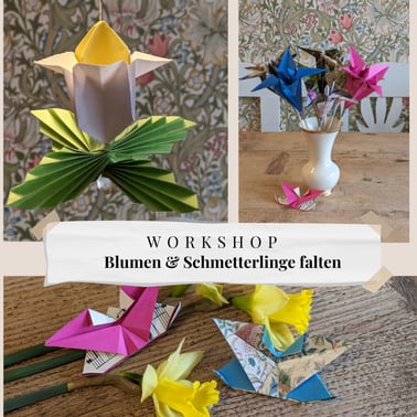 Idealerweise gehen Sie mit mindestens je zwei Exemplaren nach Hause: Schmetterlinge, Glockenblume und Lilie. Wir verwenden Origami-Papier, alte Klaviernoten. Utensilien wie Nadel und Faden, Schere, Kleber und Perlen werden gestellt.
